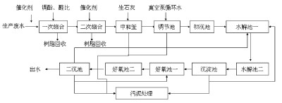 酚醛樹脂生產過程中產生的高濃度含酚廢水的處理看似簡單,實際具有一定的復雜性。由于廢水中除了含有高濃度的酚外,還含有大量的小分子酚醛樹脂及甲醛等其它物質。由于苯酚和甲醛是微生物的主要抑制物,因此應首先通過縮合手段將其除去,以提高廢水的可生化性,比較后再采用生化處理使其達標入管網。廢水處理工藝流程如圖1所示。