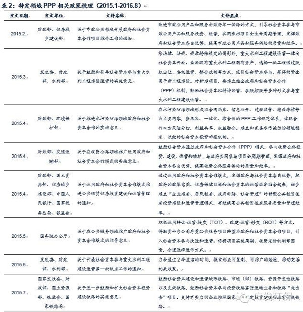 加大在特定領域開展PPP的政策扶持力度。2015年2月,財政部聯合住建部就市政公用領域開展PPP下發文件,引導社會資本參與市政公用產品和服務供給。3月,發改委、財政部、水利部聯合推進重大水利工程建設運營向社會資本開放。4月,財政部、環保部就水污染防治領域PPP工作規范體系的建立提出實施意見;財政部、交通運輸部推廣在收費公路領域的PPP模式開展。除此之外,財政部相繼又聯合國土資源部等部委,分別就公共租賃住房、鐵路建設、城市停車設施建設等領域推廣運用PPP模式下發指導性文件,引導PPP模式在特定領域的推廣,全方位推動PPP發展。
