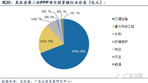 2016年9月,發改委向社會公開推介第三批針對傳統基礎設施領域PPP項目,鎖定七大傳統基建投資領域,項目數量1233個,總投資約2.14萬億元,涉及能源、交通運輸、水利、環境保護、農業、林業和重大市政工程等。發改委推介項目總額擴張至6.37萬億,考慮、第二批退庫,截至目前項目庫總容量為5.1萬億。