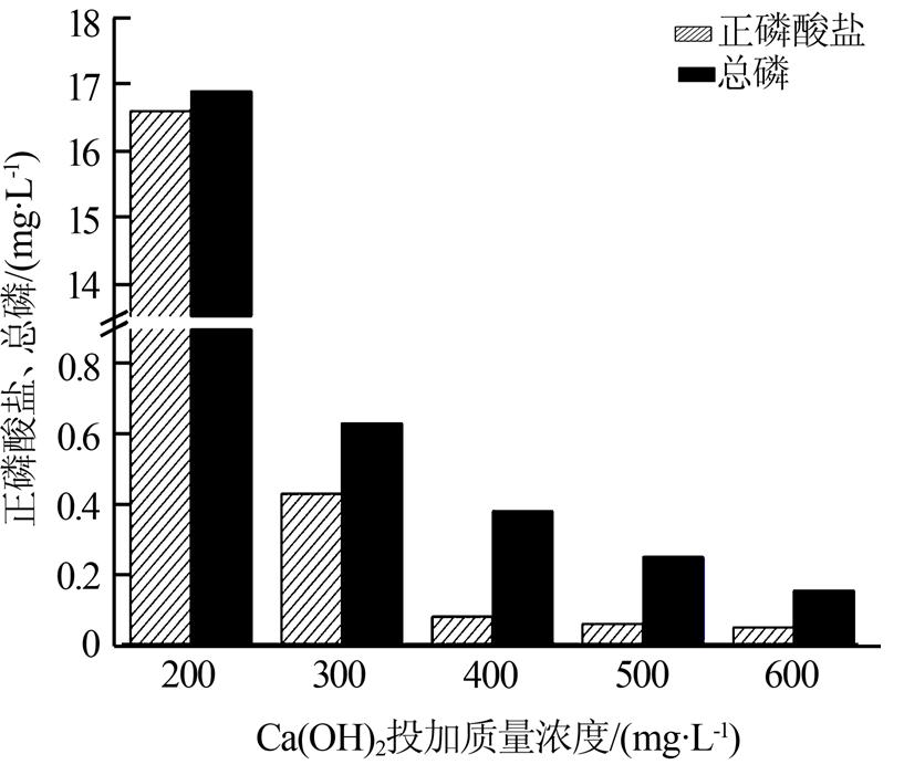 水質同2.6,考察了不同Ca(OH)2投加量對氧化后廢水中磷去除率的影響。實驗所用水樣初始總磷質量濃度為50.2 mg/L,正磷酸鹽質量濃度為49.9 mg/L。Ca(OH)2的投加質量濃度分別為200、300、400、500、600 mg/L,其對總磷和正磷酸鹽去除的實驗結果如圖 4所示。