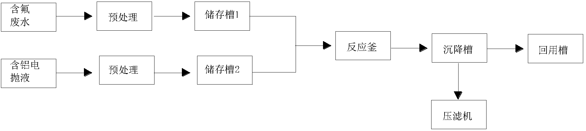 (1)將含氟廢水經過預處理后收集至儲存槽1中,將含鋁電拋液經過預處理后收集至儲存槽2中;儲存槽1中設有氟離子在線分析儀,測試氟離子濃度;儲存槽2中電拋液采用ICP光譜儀測試鋁離子濃度;
