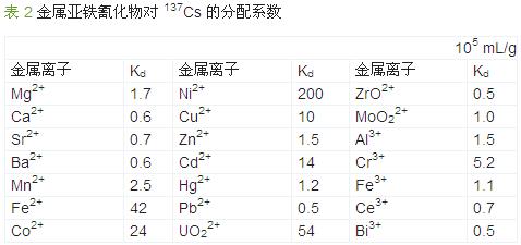 金屬亞鐵氰化物對(duì)銫的選擇性吸附能力強(qiáng) ,相關(guān)研究較多 。 Bing Li 等 〔19〕考察了亞鐵氰化鋅對(duì)低放廢水中 134Cs 的去除效果及相關(guān)影響因素。 研究結(jié)果表 明 ,pH 為 1 ~10、 134Cs 初 始 放 射 性 活 度 為 3.2 ~ 160.0 kBq/L 時(shí),投加 0.33 g/L 亞鐵氰化鋅即可去除 98%以上的 134Cs,60 min 內(nèi)達(dá)到吸附平衡,吸附量為 9.6~463.0 kBq/g。 當(dāng) 溫 度 為 0~50 ℃ 且Ca2+ 、Fe3+ 、 Mg2+、HCO3-、CO32-、Cl-、SO42- 存在時(shí) ,亞鐵氰化鋅對(duì) 134Cs 的去除效果不受影響 ,但當(dāng)溶液中含有 K+或 Na+時(shí),134Cs 去除率降低 。 Changping Zhang 等 〔20〕用亞鐵氰化鉀鋅去除模擬廢水中的銫。 靜態(tài)試驗(yàn)中 ,當(dāng)亞鐵氰化鉀鋅投加量為 0.33 g/L,Cs+質(zhì)量 濃 度 為 100 μg/L 時(shí) ,在 15 ℃下振蕩吸附 60 min 后 Cs+的去除率可達(dá) 98%以上,DF 為 76; 小試采用吸附-微濾工藝 ,持續(xù)曝氣使吸附劑與廢水充分混合,出水經(jīng)微濾膜過(guò)濾后用蠕動(dòng)泵抽出 。 試驗(yàn)處理水量 1320 L,濃縮產(chǎn)物體積為 2.28 L,出水中 Cs+的平均質(zhì)量濃度為 0.59 μg/L,平 均 DF 為 208,CF 為 539,具 有 毒 性 的 CN-質(zhì)量濃度 <2 μg/L。 V. V. Milyutin 等 〔21〕研究了不同 金 屬 的 亞 鐵 氰 化 物 共 沉 淀 微 量 銫 (105 Bq/L),當(dāng) Mn+與 Fe(CN)64-的物質(zhì)的量比為 1.33 時(shí) ,金屬亞鐵氰化物對(duì) 137Cs 的分配系數(shù)見(jiàn)表 2。