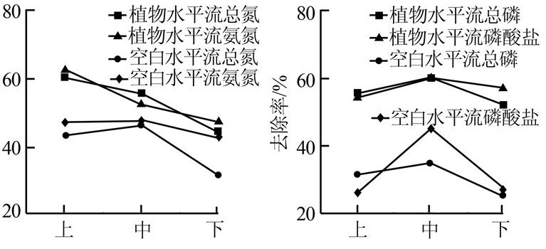 為提高水平潛流人工濕地的處理效果和預防堵塞,實驗在濕地上、下基質層采用大粒徑礫石,以利于濕地通過上部空間進行富氧及植物根系向濕地下部深處進行繁殖;中間層采用小粒徑礫石,便于增加礫石表面積,從而加大濕地基質與污水的接觸面積和微生物的附著面積。濕地對營養物去除率的空間變化情況如圖 3所示。