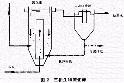 生物流化床技術融合了化工流態化技術、微生物技術與廢水處理技術,是一種新型生化處理裝置。生物流化床提高了處理設備單位容積內的生物量,強化了傳質作用,加速了有機底物從污水j句微生物細胞的傳遞過程,成為生物膜法的新突破。