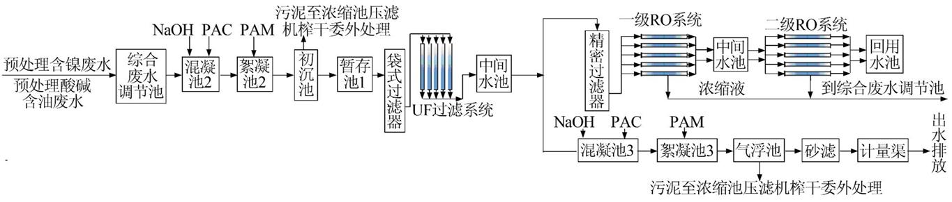 該企業廢水經過處理后,要求廢水排放指標穩定達到國家《污水綜合排放標準》(GB 8978—1996)二級排放標準,即pH為6~9,COD≤100 mg/L,SS≤70 mg/L,石油類≤5 mg/L,色度≤50 mg/L,總鎳達到《電鍍污染物排放標準》(GB 21900—2008)表2標準,即總鎳≤0.5 mg/L,實現約70%的出水回用,余下30%的出水接入市政污水管網到集中污水處理廠進行深度處理。
