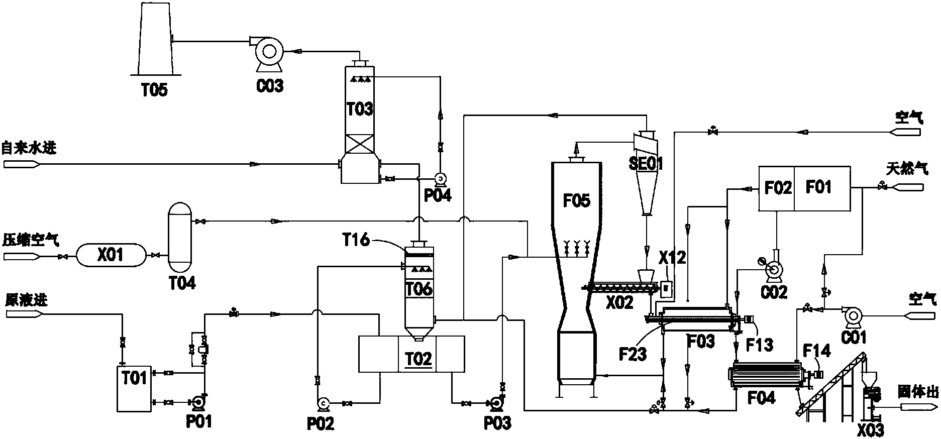 為實現上述發明目的,本發明提供了一種自含氯化鈣的污水中制備氯化鈣的裝置,包括:霧化器、與霧化器連接的濕法除塵器,所述濕法除塵器通過管道連接噴霧干燥塔,所述噴霧干燥塔通過管道連接旋風分離器、干燥設備及熱交換設備,所述旋風分離器通過管道連接返料機與霧化器;所述干燥設備通過管道分別連接燃燒裝置、熱交換設備及返料機,所述返料機通過管道與噴霧干燥塔連通,以及與霧化器頂部連接的尾氣處理裝置;所述熱交換設備通過管道分別連接霧化器及干燥設備;從外部通入的冷空氣在熱交換設備中對自干燥設備輸送至熱交換設備中氯化鈣固體進行熱交換并生成熱空氣,并通過管道將所述熱空氣輸送至霧化器中,以對霧化器中形成的呈霧化狀態的氯化鈣液滴進行加熱;所述燃燒裝置還通過管道將熱空氣輸送至噴霧干燥塔的底部。
