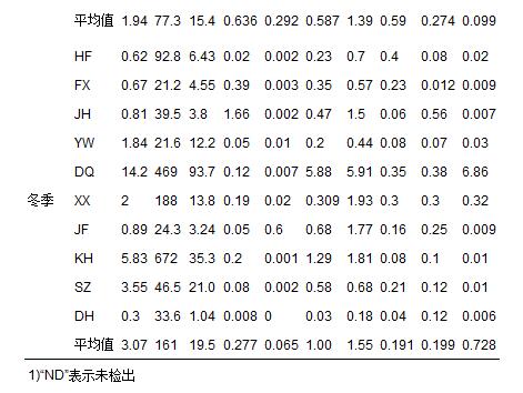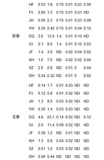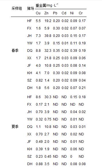 不同季節采樣組各規模化豬場沼液重金屬的含量見表 1. 銅和鋅是沼液中含量比較高的兩種重金屬,占所有豬場沼液(除了秋季HF、 FX、 JH和YW豬場沼液)重金屬濃度的97%±3%. 鉛的含量僅次于銅和鋅. 鎘、 鎳和鉻在多數豬場沼液中均有檢出,但是三者的濃度很低.