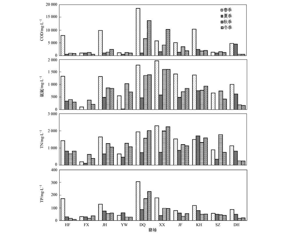 春季采樣組中,10家豬場沼液的COD濃度為1008~18479 mg ·L-1,DQ豬場濃度比較高,FX豬場比較低,二者相差了18倍. COD濃度小于2000 mg ·L-1以及在2000~6000 mg ·L-1之間的豬場各有3家,COD濃度高于6000 mg ·L-1的豬場有4家. TN濃度為205~2288 mg ·L-1,比較大值與比較小值相差了11倍; 氨氮濃度為119~1936 mg ·L-1,占TN濃度的84%±11%. 10家豬場中,有7家豬場的氨氮和TN濃度均在1000 mg ·L-1以上. TP濃度為32.6~306 mg ·L-1,其中TP濃度低于60 mg ·L-1和在60~150 mg ·L-1之間的各有3家,高于150 mg ·L-1的有4家.