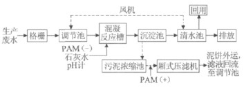 該生產廢水由格柵進入調節池,池內設曝氣裝置,對污水進行充分曝氣,使Fe2+轉化為Fe3+。因廢水呈酸性,所以調節池設計為鋼筋混凝土加防腐結構,池頂加蓋。廢水由調節池經提升泵進入混凝反應槽,通過機械攪拌,與加入的石灰水及陰離子型PAM 充分混合反應。石灰水在此不但起到調節廢水pH 的作用,還補充了Ca2+,使其與廢水中的HPO42-、H2PO4-反應生成羥基磷灰石沉淀,陰離子型PAM 則起助凝作用,使微小絮體凝聚為較大的易于沉淀的絮凝體。整個混凝處理單元由pH 在線監測儀適時監控,以準確控制反應進程及精度。混凝反應完成后,廢水在沉淀池中進行固液分離,上清液進入清水池貯存以待回用(廠方自備清水回用潛污泵),沉淀物排入污泥池中進一步濃縮。污泥經加藥調質后進入廂式壓濾機進行機械脫水,泥餅填埋處理,濾液回流至調節池重新處理。