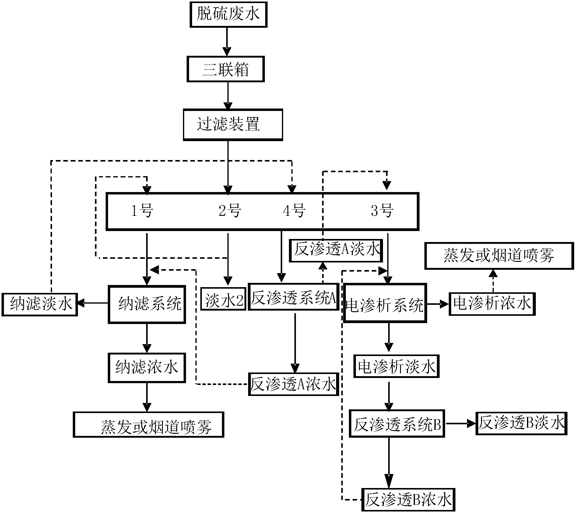 本發(fā)明的進(jìn)一步改進(jìn)在于,經(jīng)過(guò)所述2號(hào)水流道單元離子重組的產(chǎn)水回用至冷卻塔補(bǔ)水或脫硫塔給水,所述反滲透B淡水回用至脫硫塔給水。