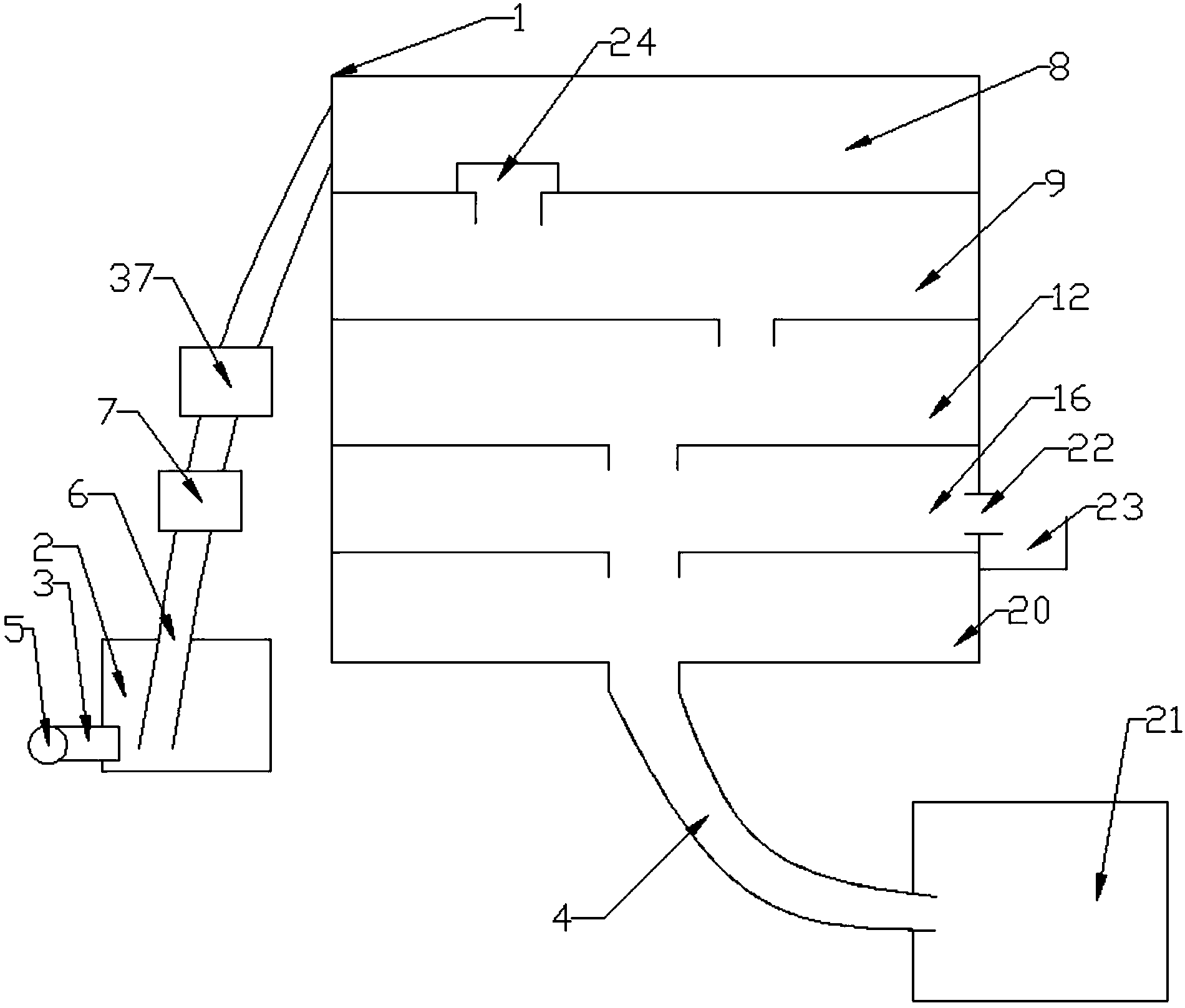 1.一種家用壁掛式洗澡水處理設備,包括機架(1),其特征在于,所述機架(1)側面設有固定安裝在地面上的儲水箱(2),所述儲水箱(2)一側開有進水孔(3),所述進水孔(3)通過導流管(4)與洗澡水排水口(5)連接,所述儲水箱(2)頂部開有出水孔(6),所述出水孔(6)內插裝有導流管(4),所述導流管(4)與儲水箱(2)底部不接觸,所述導流管(4)靠近出水孔(6)處設有過濾結構(7),所述機架(1)側面開有進水孔(3),所述導流管(4)遠離儲水箱(2)出水孔(6)的一端插裝在機架(1)側面進水孔(3)內,所述儲水箱(2)出水孔(6)與機架(1)側面進水孔(3)之間的導流管(4)上插裝有抽吸泵(37),所述機架(1)進水孔(3)下端固定安裝有活性炭過濾器(8),所述機架(1)進水孔(3)上的導流管(4)插裝在活性炭過濾器(8)的進水孔(3)處,所述活性炭過濾器(8)下端固定安裝有過濾裝置(9),所述過濾裝置(9)由過濾箱體(10)、開在過濾箱體(10)上端的進水孔(3)、由上到下一層層放置的過濾層(11)、開在過濾箱體(10)下端的出水孔(6)組成,所述活性炭過濾器(8)的出水孔(6)插入過濾箱體(10)上端的進水孔(3)內,所述過濾裝置(9)下端設有自沖洗裝置(12),所述過濾箱體(10)下端的出水孔(6)通過導流管(4)插入自沖洗裝置(12)內,所述自沖洗裝置(12)由自沖洗箱體(13)、一端插裝在自沖洗箱體(13)內另一端插裝在過濾裝置(9)內的虹吸管(14)、開在自沖洗箱體(13)側面的出水管(15)組成,所述自沖洗裝置(12)下端固定安裝有電解除污裝置(16),所述電解除污裝置(16)由電解除污箱體(17)、開在電解除污箱體(17)頂面的進水孔(3)、連通自沖洗裝置(12)出水管(15)和電解除污箱體(17)頂面的進水孔(3)之間的導流管(4)、固定安裝在電解除污箱體(17)底端的過濾網(18)、固定安裝在機架(1)上的泡沫排污管(19)組成,所述電解除污裝置(16)下端固定安裝有貯水箱(20),所述電解除污箱體(17)裝有過濾網(18)的一端的插入貯水箱體(20)內,所述貯水箱體(20)底面開有出水孔(6),所述出水孔(6)內插裝有導流管(4),所述導流管(4)遠離出水孔(6)的一端插裝在抽水馬桶(21)的進水孔(3)內。