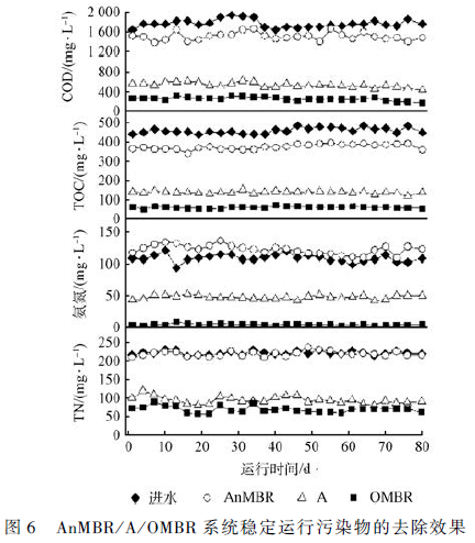 保持AnMBR/ A/ OMBR 系統在上述比較優運行參數下穩定運行80 d,考察系統連續運行階段各反應器出水COD、TOC、NH3 -N 和TN 的濃度變化如圖6所示。