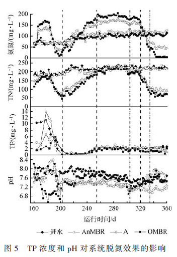 根據以上工藝運行特性,綜合考慮AnMBR/ A/OMBR 系統對COD、NH3 -N 和TN 的去除效果,確定系統的比較佳運行參數:總HRT 為61. 3 h,進水TP 濃度為(2. 3 ± 0. 3)mg·L - 1 ,控制OMBR 的pH 為(7. 5± 0. 2)。