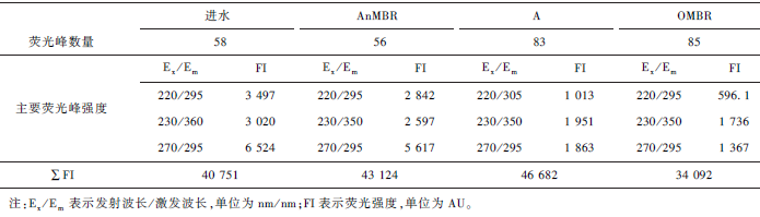 各級出水的熒光峰數量和主要熒光峰的強度變化如表3 所示。由統計結果看出,從進水到AnMBR出水,熒光峰數從58 減少到56,主要熒光峰強度下降15% 左右,與此級的COD 去除率大致相等,而熒光峰熒光強度的總和(ΣFI)增幅較小,可能與此級的COD 降解率較高有關。經過A 和OMBR 處理,OMBR出水的熒光峰數明顯增加但ΣFI 大幅下降,可能與有機污染物經過系統處理后被降解成更多的小分子物質有關。此外,OMBR 出水Ⅰ、Ⅳ區的主要熒光峰強度均大幅下降為進水的17% 和21% ,而Ⅱ區的主要熒光峰強度仍為進水的57. 5% ,是OMBR 出水中強度比較高的熒光峰。