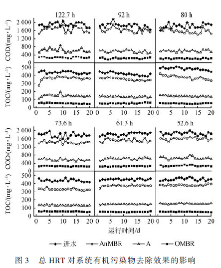 HRT 是廢水處理系統比較重要的設計和運行參數,直接影響污泥微生物降解污染物的效果,一定程度上延長HRT 可以提高污染物的降解率。但適當縮短HRT 能夠充分利用污泥的微生物生物活性,提高其有機負荷和污泥去除負荷。在保證系統處理效率的前提下,綜合考慮有機污染物的去除效果,同時使An-MBR 單級去除負荷達到比較大,確定處理系統總HRT 為61. 3 h,AnMBR、A、OMBR 各處理單元的單級HRT分別為16. 3、15 和30 h。