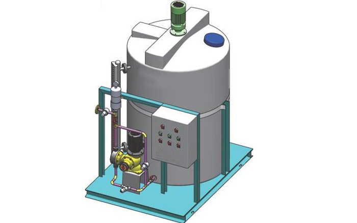 本裝置主要包括藥液溶配系統、計量投加系統、安全系統和控制系統等四部分。固體藥劑加入溶藥箱中,然后按比例加入工業水攪拌溶解,由計量投加系統投加到投藥點。投加控制采用手動方式,也可依據上位系統輸出的控制信號,進行隨動控制,自動投加。