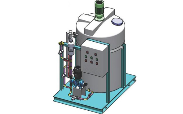 固體藥劑加入溶藥箱內(nèi)然后按比例加入工業(yè)水攪拌溶解,由計量投加系統(tǒng)投加藥點。投加控制可