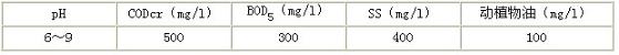 該企業(yè)污水處理后排入市政污水處理廠,必須達(dá)到污水排入城市下水道的水質(zhì)標(biāo)準(zhǔn),即GB8978-1996《污水綜合排放標(biāo)準(zhǔn)》表4中三級(jí)標(biāo)準(zhǔn),主要污染物允許排放濃度如下: