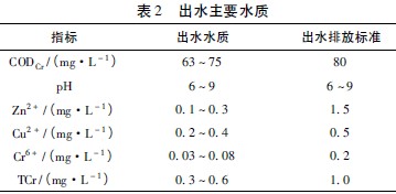 2012 年5 月份,該工程完成后,經(jīng)過(guò)一個(gè)星期聯(lián)動(dòng)調(diào)試,完成整個(gè)系統(tǒng)調(diào)試運(yùn)行,出水各項(xiàng)指標(biāo)達(dá)到《電鍍污染物排放標(biāo)準(zhǔn)》(GB21900-2008) 要求,并經(jīng)過(guò)3 個(gè)月的運(yùn)行,效果良好。COD 去除率70%以上,六價(jià)鉻離子、鋅離子、銅離子去除率均在99%以上。處理出水達(dá)到處理效果見(jiàn)表2。