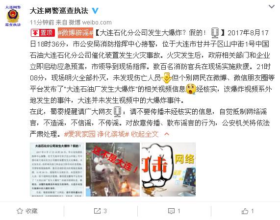 事故發生之后,網上流傳的許多視頻不實,有人以為是發生大爆炸,但大連警巡查執法微博公告稱,此事故并未發生大爆炸事件。