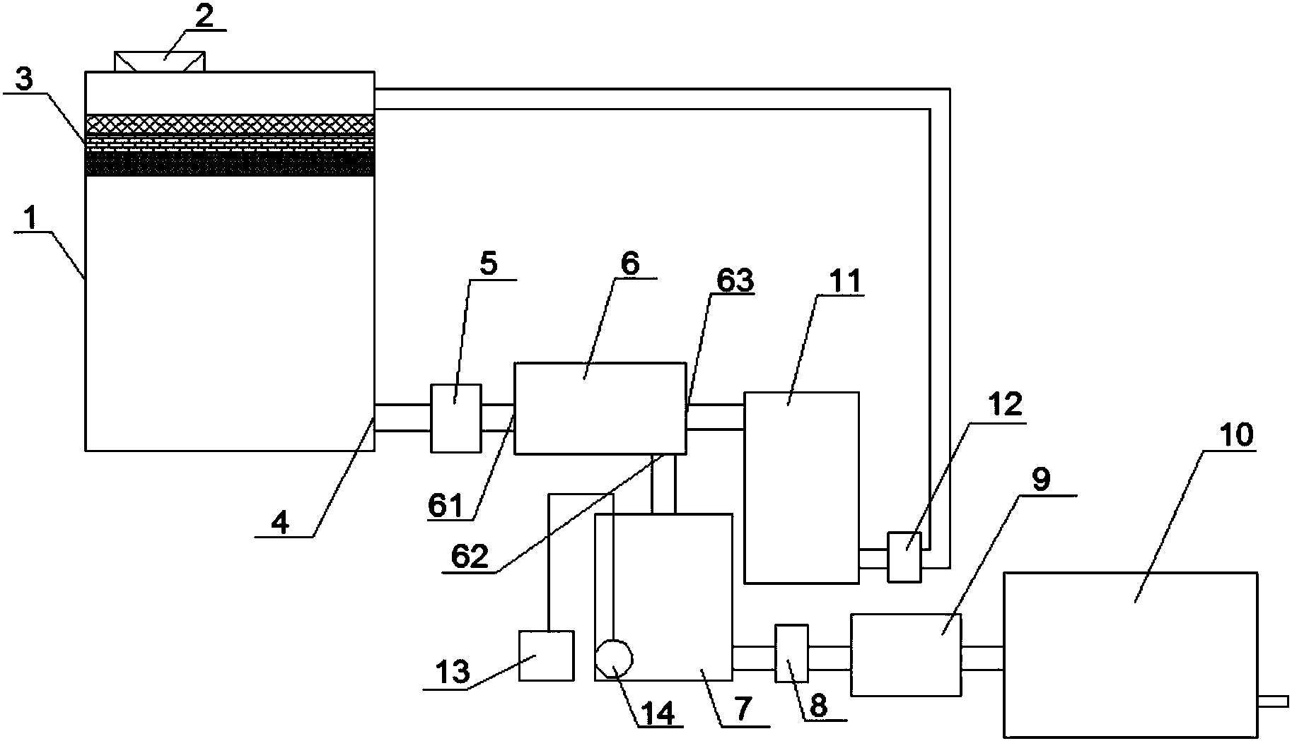 1.一種環(huán)保型廢水回收設(shè)備,其特征在于:包括廢水收集箱(1),所述廢水收集箱(1)上設(shè)置有廢水入口(2),所述廢水收集箱(1)內(nèi)設(shè)置有過濾層(3),所述廢水收集箱(1)下端設(shè)置有廢水出口(4),所述廢水出口(4)依次連接有抽水泵(5)、管式膜組件(6)、透過液箱(7)、第二抽水泵(8)、反滲透膜組件(9)和回收水箱(10),所述管式膜組件(6)包括進水口(61)、透過液出口(62)和濃縮液出口(63),所述抽水泵(5)與所述進水口(61)連接,所述透過液出口(62)與所述透過液箱(7)連接,所述濃縮液出口(63)依次連接有濃縮液箱(11)和第三抽水泵(12),所述第三抽水泵(12)的出口與所述廢水收集箱(1)連通,所述透過液箱(7)一側(cè)設(shè)置有臭氧機(13),所述臭氧機(13)上設(shè)置有氣爆石(14),所述氣爆石(14)位于所述透過液箱(7)內(nèi)。