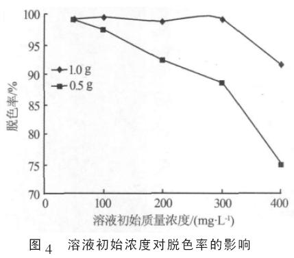 由圖4 可知, 復(fù)合絮凝劑投加質(zhì)量為0.5 g 時,隨溶液初始濃度的增加,脫色率呈下降趨勢;當(dāng)投加質(zhì)量為1.0 g 時,在溶液初始質(zhì)量濃度﹤300 mg/L 的范圍內(nèi)均有95%以上的脫色率,溶液初始質(zhì)量濃度超過300 mg/L 以后,脫色率顯著下降。這說明單位質(zhì)量絮凝劑存在一比較大絮凝量, 超過此范圍處理效果下降。
