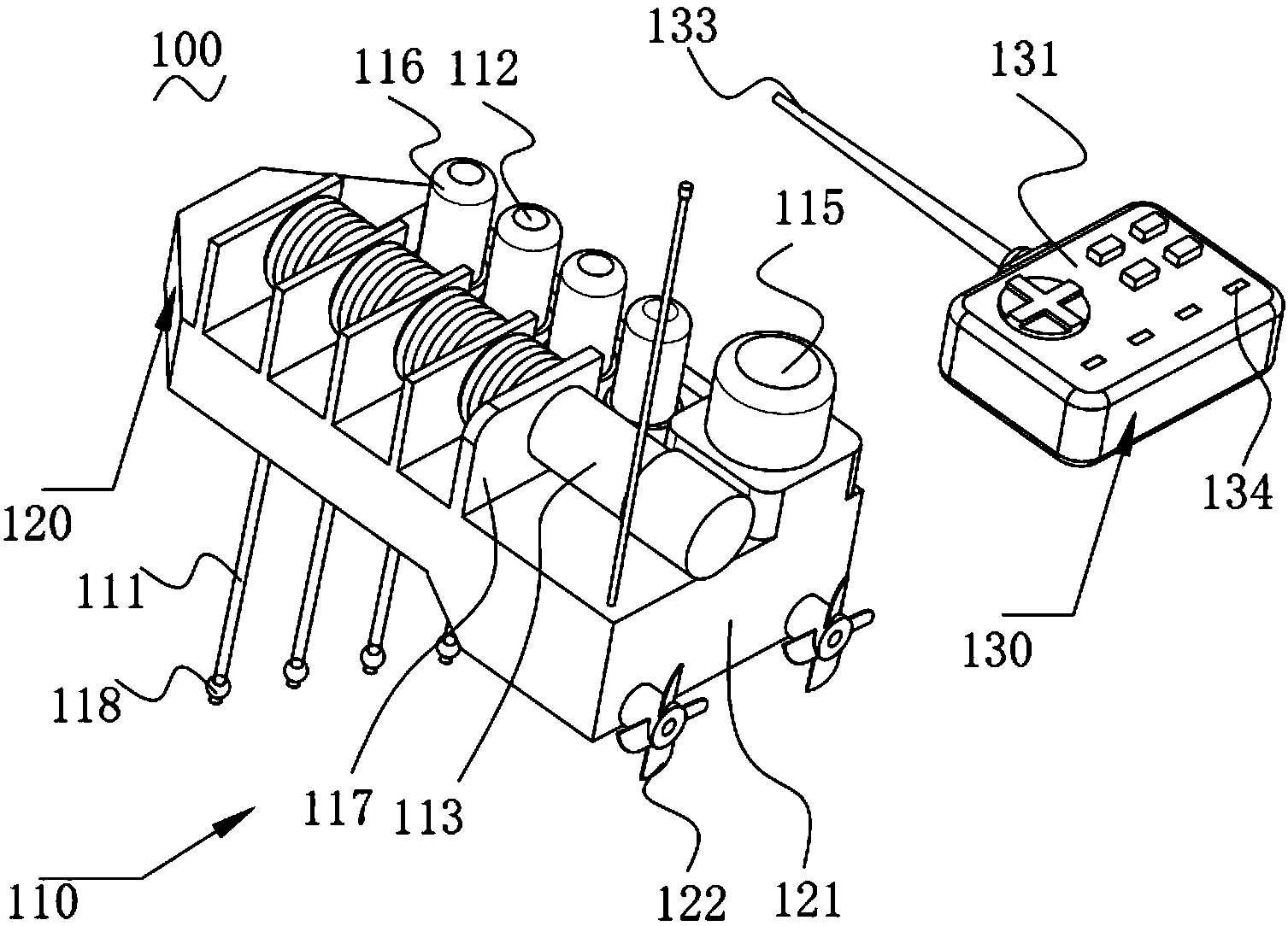 8、控制組件還包括嵌設(shè)于遙控器上用于指示采樣進(jìn)程的若干個(gè)報(bào)警器和若干個(gè)提示燈,所述報(bào)警器和提示燈的數(shù)目與試管的數(shù)目相匹配,通過報(bào)警器和提示燈,指示采用進(jìn)程,如當(dāng)采樣完成時(shí),報(bào)警器發(fā)出警報(bào),提示燈閃亮,工作人員收到信號后停止采樣,進(jìn)一步增加了本實(shí)用新型使用的便利性。