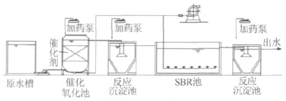 將廢水泵入催化氧化池(內(nèi)置催化劑,底部采用微孔曝氣充氧及攪拌),并由加藥泵定量投加氧化劑,氧化劑以H2O2為主復(fù)配制成;催化氧化出水經(jīng)硫酸亞鐵混凝沉淀后進(jìn)入SBR 生化處理系統(tǒng)處理(污泥取自該企業(yè)污水處理好氧池),由PLC 進(jìn)行周期性控制,其出水由硫酸亞鐵混凝沉淀處理。