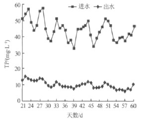 草甘磷廢水經(jīng)催化氧化處理后進(jìn)入SBR 反應(yīng)器,停留時間為24 h,SBR 出水再與硫酸亞鐵進(jìn)行混凝反應(yīng)。在SBR 反應(yīng)器中接種活性污泥,加入體積分?jǐn)?shù)為10%的草甘磷廢水,悶曝2 d,然后按5%的速率遞增連續(xù)進(jìn)水,逐步提高處理負(fù)荷,第21 天開始滿負(fù)荷進(jìn)水,TP 變化趨勢如圖5 所示。