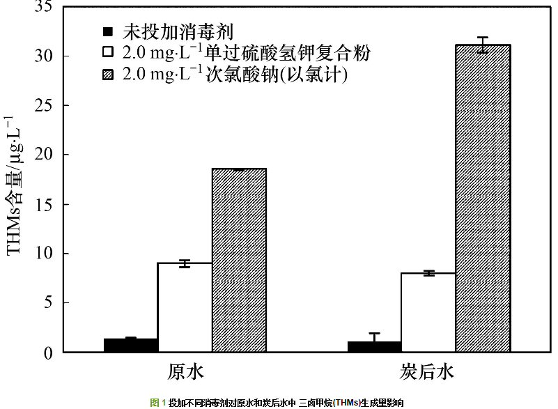 由圖 1和圖 2可以看出,原水和炭后水投加兩種消毒劑后,水中有機物與兩種消毒劑均發生反應生成了DBPs,其中THMs和HAAs含量相對原水和炭后水有明顯上升. 原水的THMs和HAAs含量分別為1.41 μg·L-1和0.59 μg·L-1,投加2.0 mg·L-1單過硫酸氫鉀復合粉后THMs和HAAs含量提高至8.98 μg·L-1和6.72 μg·L-1,相應地投加次氯酸鈉后二者含量增至18.54 μg·L-1和22.06 μg·L-1. 對于炭后水而言,也取得了相似的試驗結果.