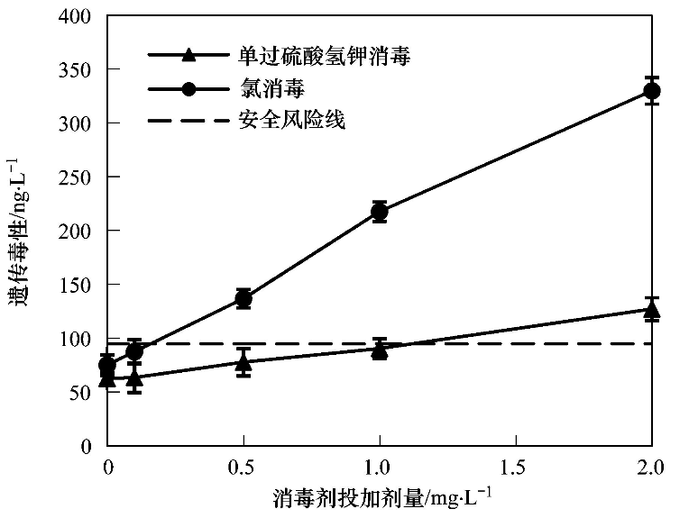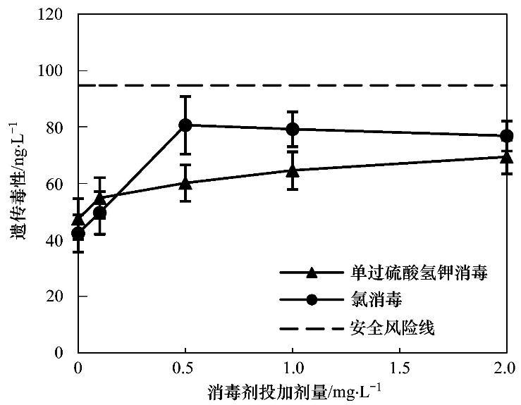 原水在氯的投加量達到0.5 mg·L-1時,遺傳毒性當量濃度為137.0 ng·L-1,已高于安全風險閾值(94.8 ng·L-1),隨著氯投加量的增大,遺傳毒性呈較為快速增長的趨勢. 原水中投加氯消毒后的遺傳毒性明顯高于單過硫酸氫鉀復合粉消毒,并且明顯高于安全風險閾值. 但在單過硫酸氫鉀復合粉投加量達到2.0 mg·L-1時,遺傳毒性當量濃度為127.1 ng·L-1,超過了安全閾值,說明當水樣有機物較多時,提高單過硫酸氫鉀復合粉的投加量也存在著一定安全風險.