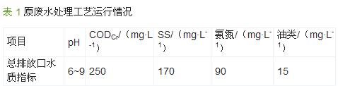 該工藝運(yùn)行初期處理效果較好,基本能達(dá)到《污水綜合排放標(biāo)準(zhǔn)》的三級(jí)標(biāo)準(zhǔn)要求。隨著生產(chǎn)規(guī)模擴(kuò)大及排放標(biāo)準(zhǔn)的提高,現(xiàn)城市污水處理廠不再接納該廠排放污水,該廠排放污水需滿足污水排放標(biāo)準(zhǔn)一級(jí)標(biāo)準(zhǔn),直接排放到附近河流。因此需對(duì)原工藝進(jìn)行技術(shù)改造。原廢水處理工藝運(yùn)行情況如表1所示。