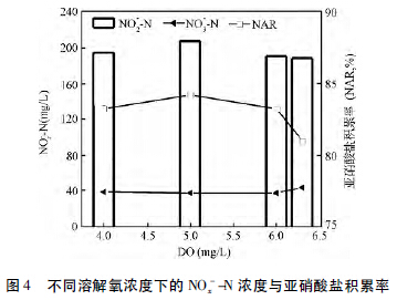 在低DO 下,AOB 的增殖速率加快,補償了由于低DO 所造成的代謝活動下降,同時AOB 對DO 的親和力強于NOB,使得NH4+ →NO2-的過程未受到明顯影響,而NOB 氧化NO2-的能力卻大大減弱,從而造成系統中亞硝態氮的積累。本實驗采用包埋固定微生物技術,氧氣和底物需通過載體內的微孔進行傳遞,導致氧利用率降低,較污泥體系所需DO 質量濃度要大。圖4 中,將DO 分別控制在4、5、6、6.3 mg /L,水溫保持在25~30℃之間。包埋載體的密度大于水,曝氣量需使載體在反應器中呈流化狀態,才能保證氣液固三相均勻接觸,否則載體沉積在反應器底部,當DO 為5 mg /L 時,NO2--N 濃度和NAR都達到了比較大值,分別為209.43 mg /L 和84.3%,NH4+-N出水濃度為21.6 mg /L,此時DO 既能滿足AOB 代謝活動,又能有效地抑制NOB 的活性。當DO > 5 mg /L 時,NOB 氧化NO2-的能力變強,同時短程硝化產生大量的NO2--N,作為NOB 生長的底物,短程硝化向全程硝化轉變,同時DO 過高也會加大載體間的摩擦從而減少其使用壽命。因此,DO 要控制4.0~5.5 mg /L 之間。Yan 等用包埋微生物技術處理富含氨氮的有機廢水,研究了DO 對短程硝化過程的影響,當DO 為4.2~4.6 mg /L 時,短程硝化效果較好,COD 去除率較高,在DO為4.6 mg /L 時,亞硝酸鹽積累率和COD 去除率都達到比較大值,分別為63.1% 和66.3%,比較佳DO 濃度范圍與本實驗相近。