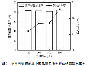 有機負荷越高,異養菌的活性越高,增值速率越快,生物合成作用利用的氨氮也越多,造成AOB 利用的底物與DO 減少,導致亞硝化速率降低。圖6 考察了包埋載體在不同有機物濃度下的處理效果,進水氨氮濃度300 mg /L,停留時間12 h,用葡萄糖作為有機物的來源,葡萄糖的投加量根據有機物的濃度進行配置。由圖可知,氨氮去除率隨著有機物濃度的增加而增加,在400 mg /L 時達到比較大值93.0%,在200~300 mg /L 時氨氮去除率維持在88.5%。氨氮去除率的升高可能是低濃度有機物的存在對AOB 的活性具有一定的促進作用,提高了其氧化氨氮的能力。當有機物濃度為100、200、300 和400 mg /L 時,NAR分別為83.3%、83.0%、81.8% 和83.8%。可見低濃度的有機物并未對AOB 的活性產生明顯的抑制,包埋載體的亞硝化速率并未降低,短程硝化效果良好。因此,低濃度有機物可以提高包埋載體的氨氮去除率,對短程硝化的抑制作用不明顯,同時包埋載體為AOB 的活性起到很好的保護作用,能夠抵御有機負荷的變化。