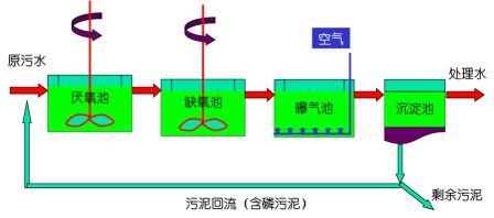 厭氧/缺氧/好氧(Anaerobic-Anoxic-Oxic,簡(jiǎn)稱A/A/O或A2/O)生物脫氮除磷工藝由厭氧池、缺氧池、好氧池串聯(lián)而成,是A1/O與A2/O流程的結(jié)合。在該工藝流程內(nèi),BOD5、SS和以各種形式存在的氮和磷將一并被去除。A/A/O生物脫氮除磷系統(tǒng)的活性污泥中,菌群主要由硝化菌、反硝化菌和聚磷菌組成。以上三類細(xì)菌均具有去除BOD5的作用,但BOD5的去除實(shí)質(zhì)上以反硝化細(xì)菌為主。