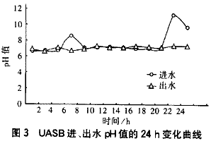 由于廠區(qū)占地有限,UASB之前未設(shè)調(diào)節(jié)池,進(jìn)水COD濃度、pH值一天之內(nèi)波動(dòng)很大。在較強(qiáng)的沖擊負(fù)荷下,UASB出水有時(shí)帶出一些絮狀污泥,使其COD增高,在一定程度上影響了出水水質(zhì),但從總的運(yùn)行來(lái)看,UASB具有較強(qiáng)的抗廢水沖擊能力,處理效果穩(wěn)定,出水COD(混合液)一般在500 mg/L左右,pH在7左右。2001年6月6日對(duì)UASB進(jìn)行了24 h連續(xù)監(jiān)測(cè),所測(cè)數(shù)據(jù)包括進(jìn)、出水COD濃度、pH值,其中出水COD分別測(cè)混合液和上清液兩種水樣。圖2、3分別為UASB進(jìn)、出水COD和pH值的24 h變化曲線。