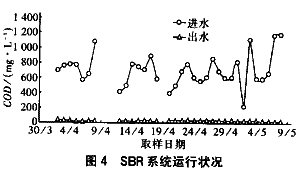 UASB正常運(yùn)行后,厭氧出水和鍋爐廢水混合后的COD濃度比以前大大降低,但水質(zhì)波動(dòng)仍然很大(COD濃度在400~1 200 mg/L之間)。盡管如此,SBR的出水COD濃度始終保持在20~40 mg/L之間。從實(shí)際運(yùn)行來(lái)看,該系統(tǒng)經(jīng)過(guò)改造后,SBR反應(yīng)池運(yùn)行更加穩(wěn)定,出水水質(zhì)較好。圖4為SBR反應(yīng)池進(jìn)、出水COD濃度的變化情況,整個(gè)系統(tǒng)監(jiān)測(cè)結(jié)果見(jiàn)表4。