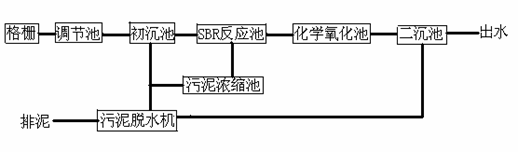 (1) PH=6~9 工藝優點: SBR相對于連續流系統有許多其它方面的優點。首先,這種反應器運行靈活簡潔。它可以配合不同的進水水質調整運行模式。第二,SBR流態上屬于完全混合,而在有機物降解方面卻是時間上推流。因此為了達到較高去除率而只需調整反應時間。這樣大大減少了占地,特別適合中小型水廠。第三,SBR的沉淀階段使泥水有效分離,出水懸浮物濃度低,無需另設澄清池。第四,SBR工藝很多情況還可不設初沉池,因而基建費用低,占地少。 化學氧化法是利用化學氧化劑的氧化作用將水中的污染物轉化為微毒或無毒的物質,或將其轉化易于分離的形態的處理方法。他比較終能實現污染物的無害化處理。其特點為反應速度快,適用范圍廣,可使部分有機物礦化。反應條件溫和,通常對溫度和壓力沒有要求,不需要在強酸強堿介質中進行。由于是一種物理化學處理過程,易于控制,化學氧化法操作簡單,易于設備化。 1.5 流程簡圖