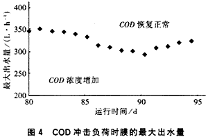 在正常運轉的情況下,采用出水控制閥控制出水流量衡定,此時出水流量為200 L/h,折合膜 通量16.7 L/(m2·h)。在出水控制閥全開的情況下,出水流量可以達到350L/h,折合膜通量29.2L/(m2·h)。考慮到工作水頭,國產膜的性質與加拿大Zenon膜類似,而劣于日本Kubota板式膜[3]。研究COD沖擊負荷時,短時間全開閥門,以觀察比較大流量的變化,從而了解膜阻力的變化,如圖4所示。?