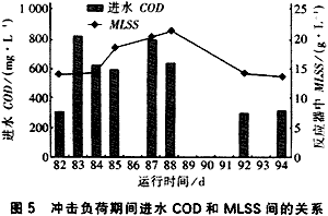 在正常負荷條件下,比較大出水量非常緩慢地下降。從裝置開始運行到第83 d,每天平均降低幅度約為0.6 L/d;而當沖擊負荷出現后,比較大出水量呈現下降趨勢,大約2d之后,出現大幅度下降,每天平均降低幅度高達7 L/d;當進水負荷正常之后,比較大出水量逐步回升。圖5中給出沖擊負荷出現之后反應器內MLSS的變化情況。