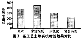 試驗比較了PPC預處理工藝、常規工藝、預氯化加粉末活性炭工藝(以下簡稱Cl2+PAC工藝)的除有機污染物效能。