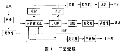 根據廢水性質,我們采用了三個處理單元去除污染物:單元采用格柵脫渣,去除廢水中粗顆粒的懸浮物,可回收作為飼料或肥料;第二單元采用脫色和水解酸化預處理,提高廢水的可生化性[2],同時沉淀去除懸浮物,通過物化作用脫色。第三單元采用厭氧、好氧、兼氧生化處理,徹底降解有機物。厭氧采用上流式厭氧流化床反應器(UASB)[3],好氧采用間歇式活性污泥反應池(SBR)[4],整個處理系統耐沖擊負荷能力強。