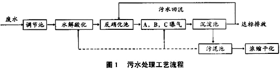通過對生產裝置和廢水水質調查,選用前置反硝化的生物脫氮工藝,處理工藝流程見圖1。