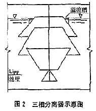 ①由于廢水處理設(shè)施正好位于原有的池塘上,其地基承載力和土質(zhì)均勻度都很差,如采用鋼筋混凝土結(jié)構(gòu),由于其自重大,地基處理費用就相當(dāng)高。厭氧罐和貯氣柜設(shè)計采用德國引進(jìn)的Lipp罐體,由于罐體自重輕,基礎(chǔ)比較容易處理,費用隨之降低。厭氧消化罐高為9 m,直徑為7 m,是地上式圓形Lipp罐。由于對厭氧消化罐的徑、高比進(jìn)行了調(diào)整,原有的三相分離器就不是很適合。因此,對三相分離器進(jìn)行了重新設(shè)計,采用三層鋼結(jié)構(gòu)漏斗式導(dǎo)流板做三相分離器(見圖2)。從使用結(jié)果看,三相分離效果相當(dāng)好,厭氧污泥流失量很小,污泥截留效果明顯。