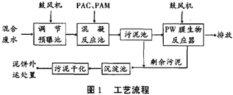 混合廢水通過格柵,大顆粒可沉固體及漂浮物被攔截,進入調節池,經調節水量、水質和預曝氣后用泵輸送至混凝反應池,分別加入適量的PAC、PAM溶液進行混凝和絮凝反應,反應液自流入沉淀池進行固液分離。經過上述預處理的廢水上清液溢流進入PW-W膜生物反應器,在充氧曝氣和微生物的作用下將有機物降解為二氧化碳和水,并由膜組件進行固液分離,處理后廢水達標排放。